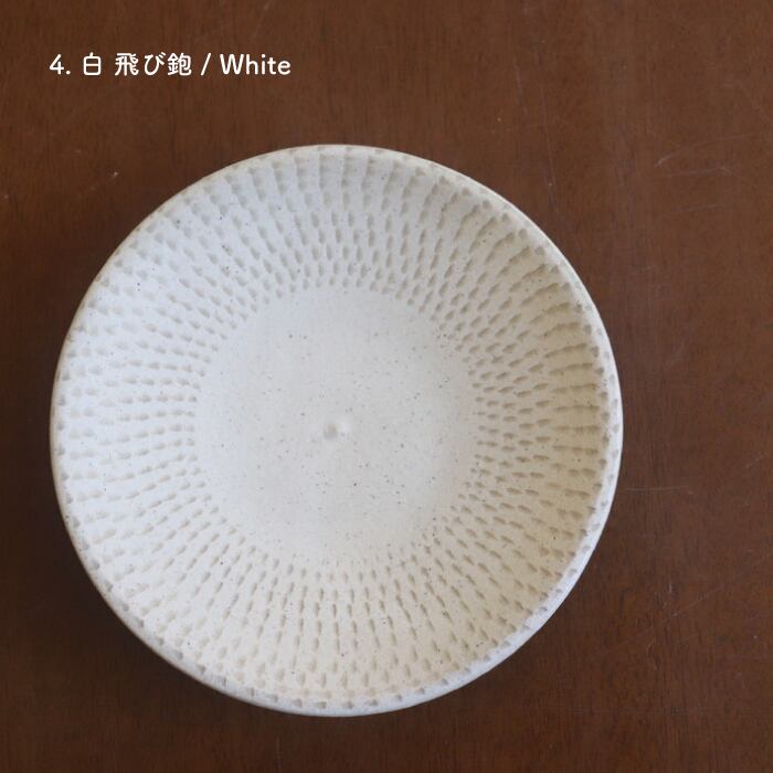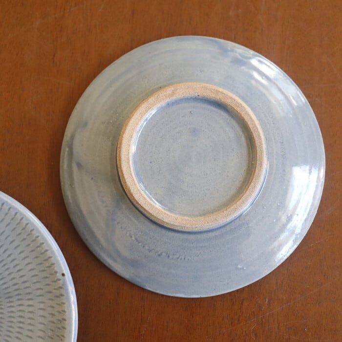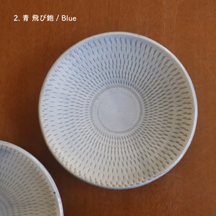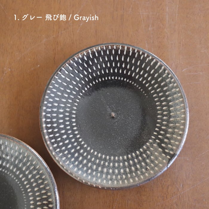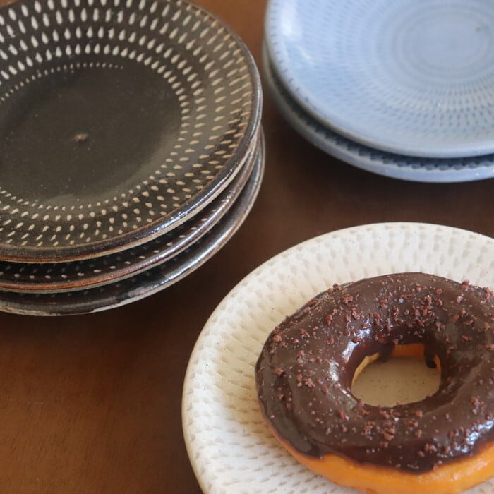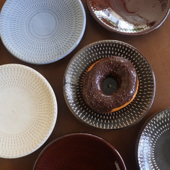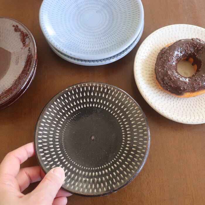 飛び鉋(とびかんな)の装飾が施された益子焼(栃木県)の丸皿。程よい厚みで持ちやすく、取り皿にぴったりのサイズ感。ほうれん草のソテーやきのこのマリネなど、一品料理も使いやすい大きさです。収納しやすい形状なので、色違い、柄違いで揃えても、食卓が賑わいそうです♬