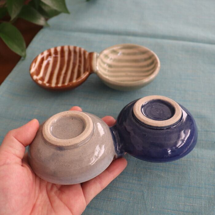 益子焼(栃木県)ポップな色味とスタライプ模様がかわいらしい、2連の豆皿。程よく深さがあるので、ネギやしょうが、しそなどの薬味類を入れたり、マヨネーズやチリソースなどのソースを入れるのに使いやすい大きさです。レモンやスダチなどの薬味柑橘を入れたり、カレーのおともに、福神漬けとらっきょう付けをのせたり、などなど。いろいろに活用したくなりそうです★