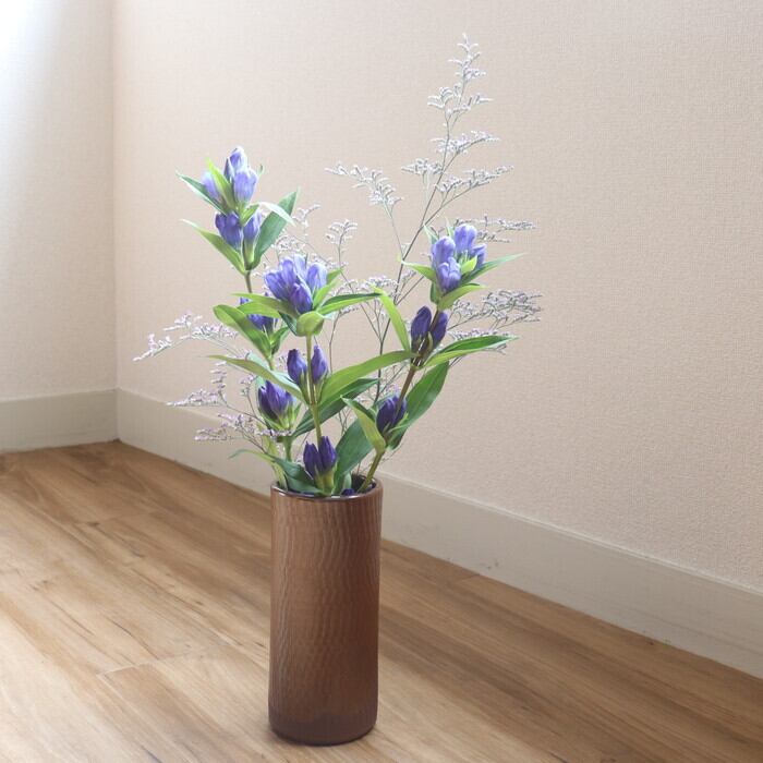 小石原の茶色い土の色を生かしたデザインは、表面に大きめの飛び鉋が刻まれ、光沢のある釉薬のかけ具合にて独特の模様が生みだされています。落ち着いた色味のシンプルな花瓶なので、洋っぽいアレンジメントにも合いそうです。