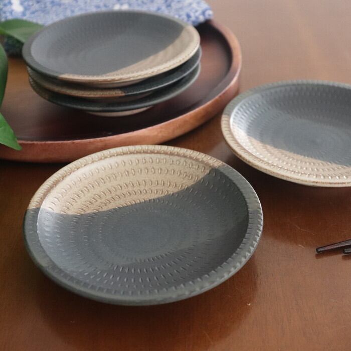 マットな黒、グレー、ベージュで掛け分けられたデザインは、シックな色合いで、洗練された雰囲気。釉薬の下に刻まれた飛び鉋の模様も、主張しすぎずカッコいい♬
