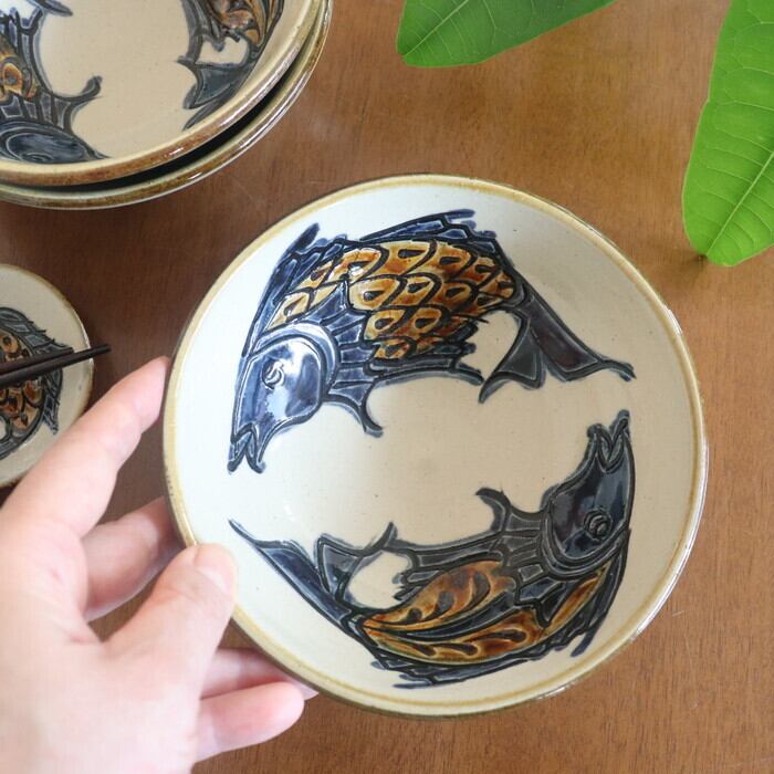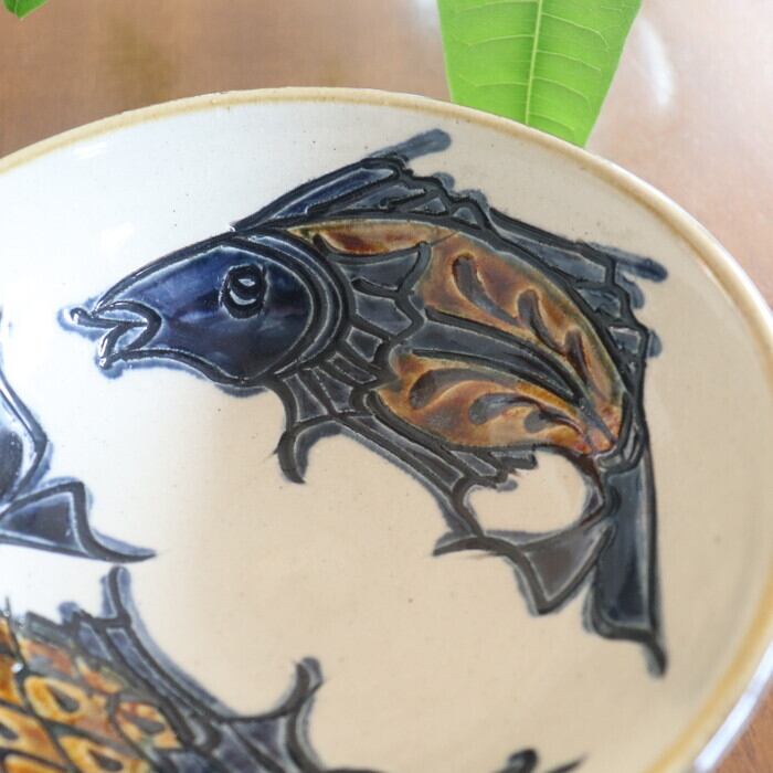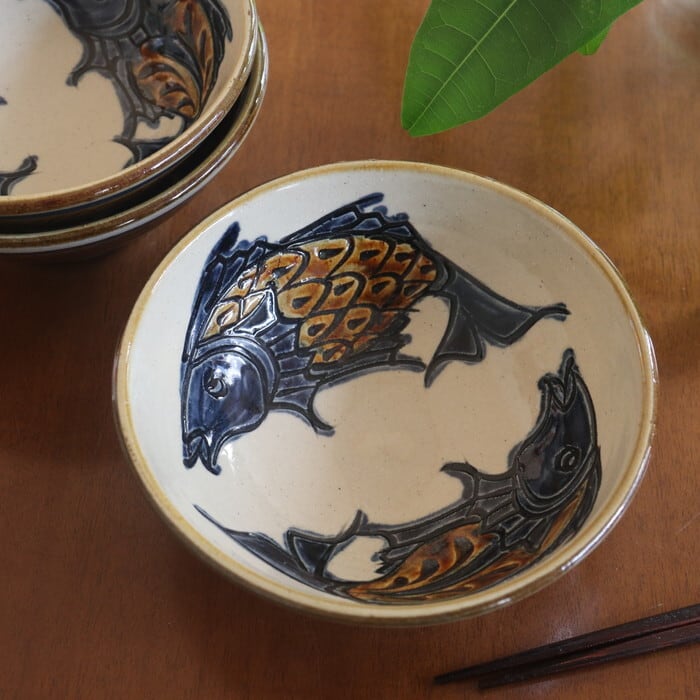 インパクトのある2匹の魚が内側を囲む、やちむん(沖縄の焼き物)の5寸鉢。サラダや煮物など1~2人前用のおかずや、フルーツ、ご飯もののどんぶりにも使いやすいサイズです。