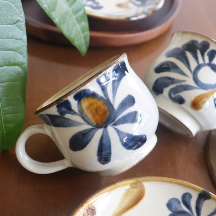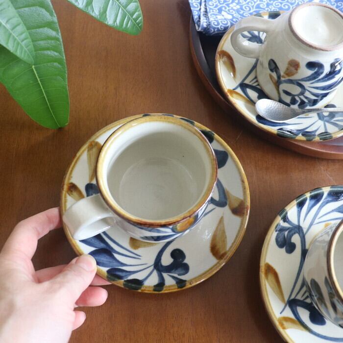 カップは、指1~2本が入る握り心地のよい取手がついた安定感のあるコロンとしたフォルム。表と裏に絵柄の異なる唐草が描かれ、落ち着いていながら愛らしいデザインです。