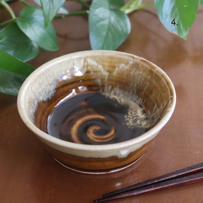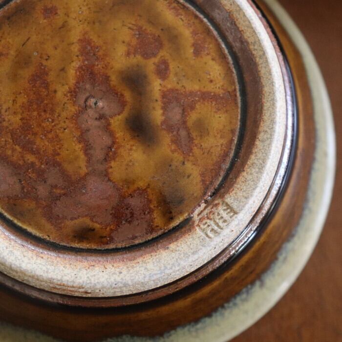 飴釉(濃茶)のベースに藁灰釉(クリーム色)を掛け合わせたデザインは、益子焼の伝統的な様式ながら、モダンなフォルムとマッチして、洗練された雰囲気に。洋食や中華のおかずとも相性が良さそうです♬
