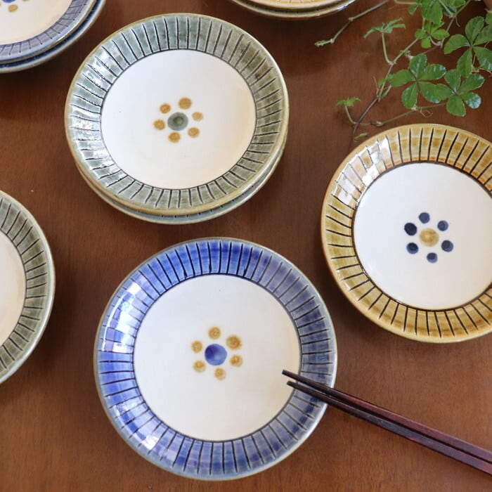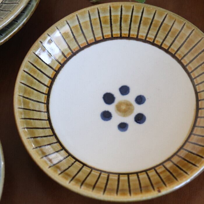 キラキラ輝くふちが印象的なやちむん(沖縄の焼き物)の小皿。お漬物や青菜のおひたしといった副菜やフルーツ、焼き菓子や和菓子などにぴったりのサイズ。取り皿にも使いやすい大きさです。
