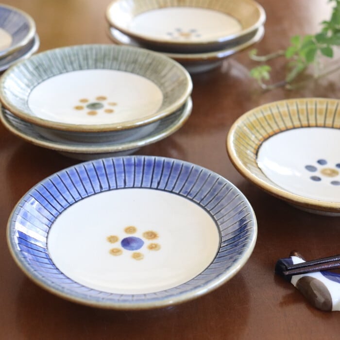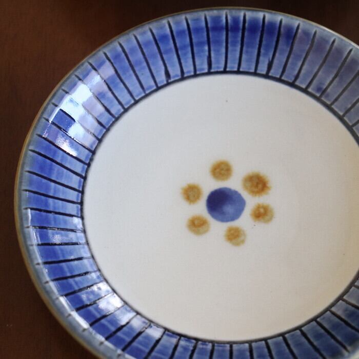 花ぐ~は、壼屋焼の伝統的な絵付けの紋様で、真ん中のお花のようなドット模様のこと。ふちに一本一本手彫りされた線と光沢のある釉薬がマッチして、落ち着いていながらも可愛らしいデザインに。赤や緑のカラフルな野菜をのせたくなります★