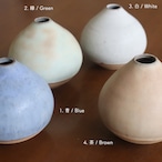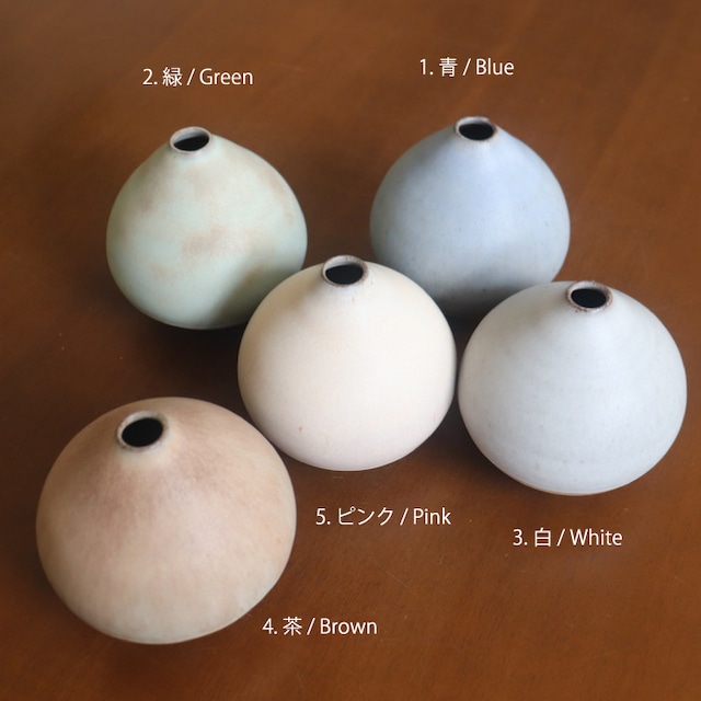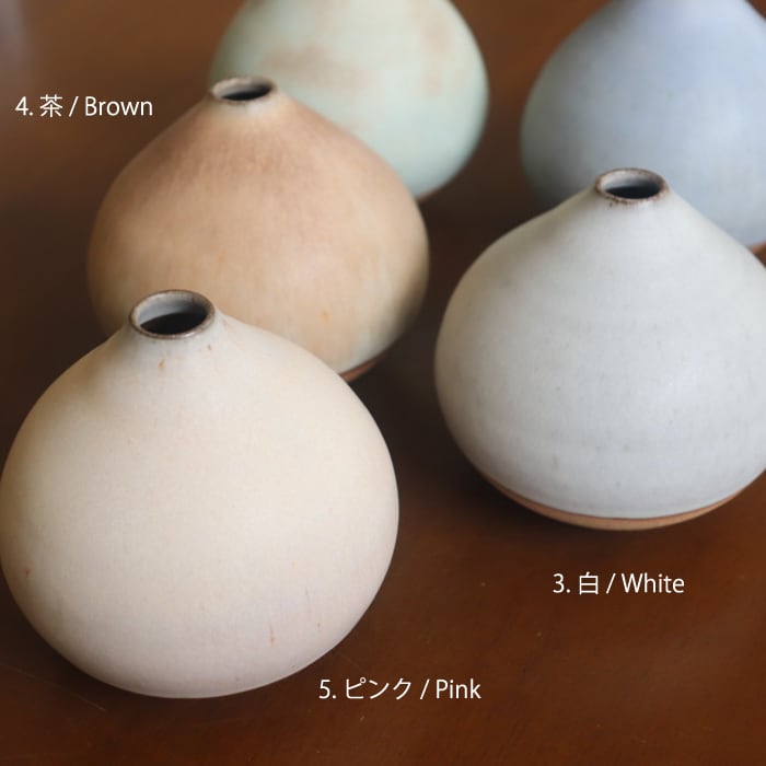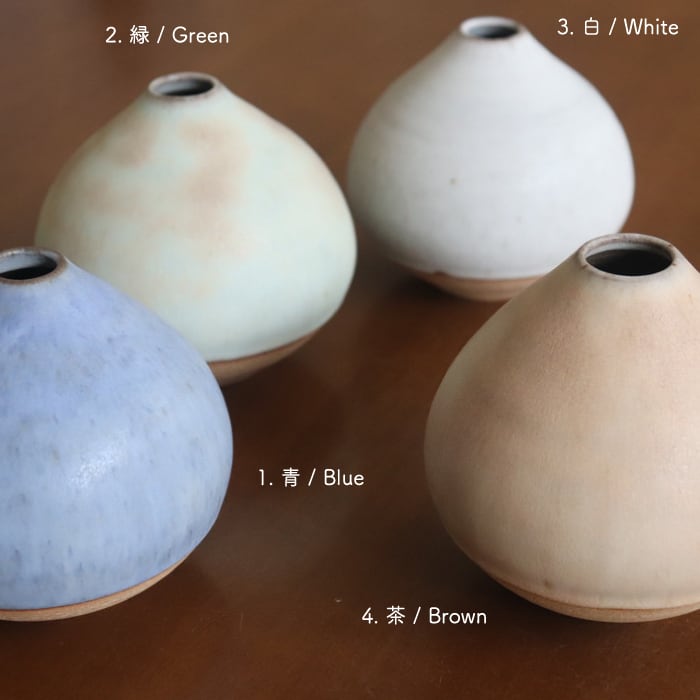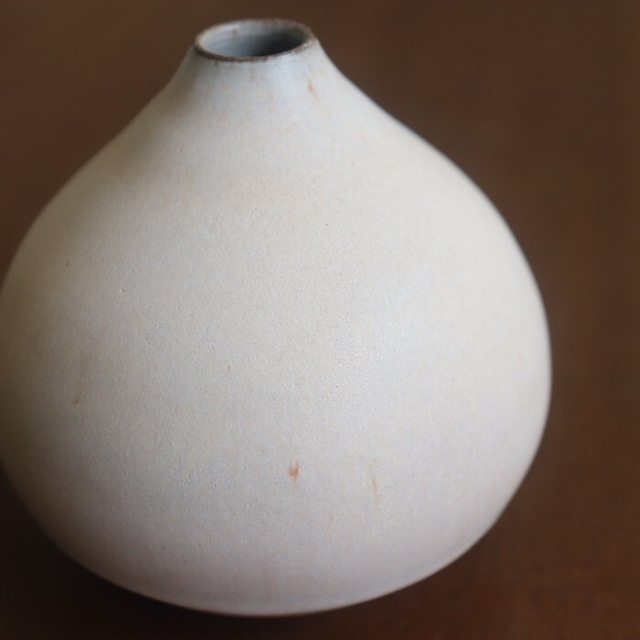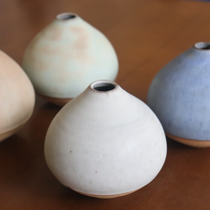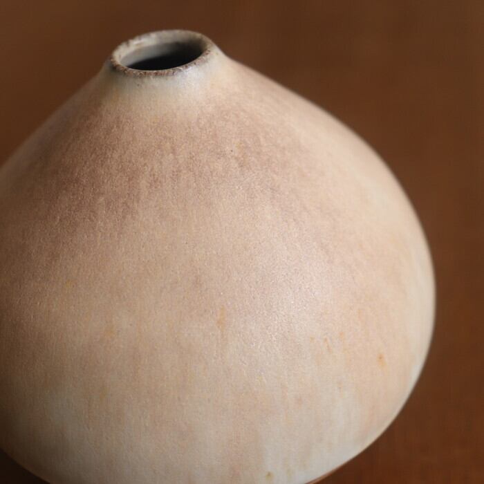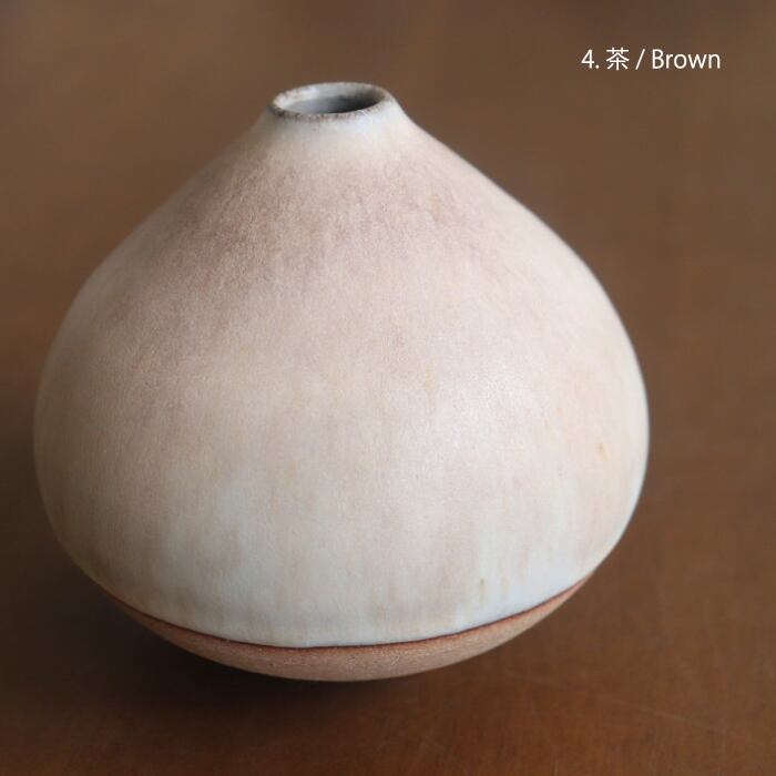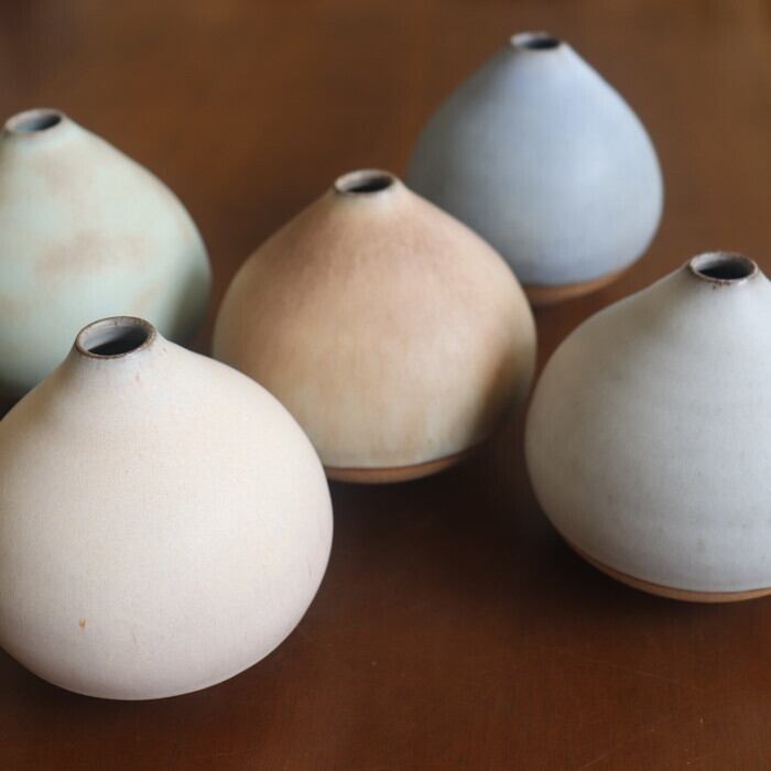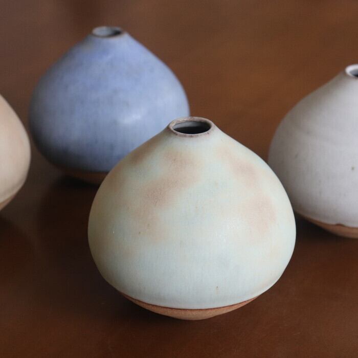 栗のようなコロンとしたフォルムが愛らしい花入れ。作り手の比呂さんは、故郷の水戸(茨城)でひとり作陶されている作家さん。日々の生活の身近に花や植物を感じられるようにと、野に咲く花や庭の枝木をちょこっと入れるのに使いやすいデザインを目指しているとのこと。つるんとした手触りの淡い釉薬の色合いもかわいらしく、お部屋に置くだけでウキウキしそうです♬