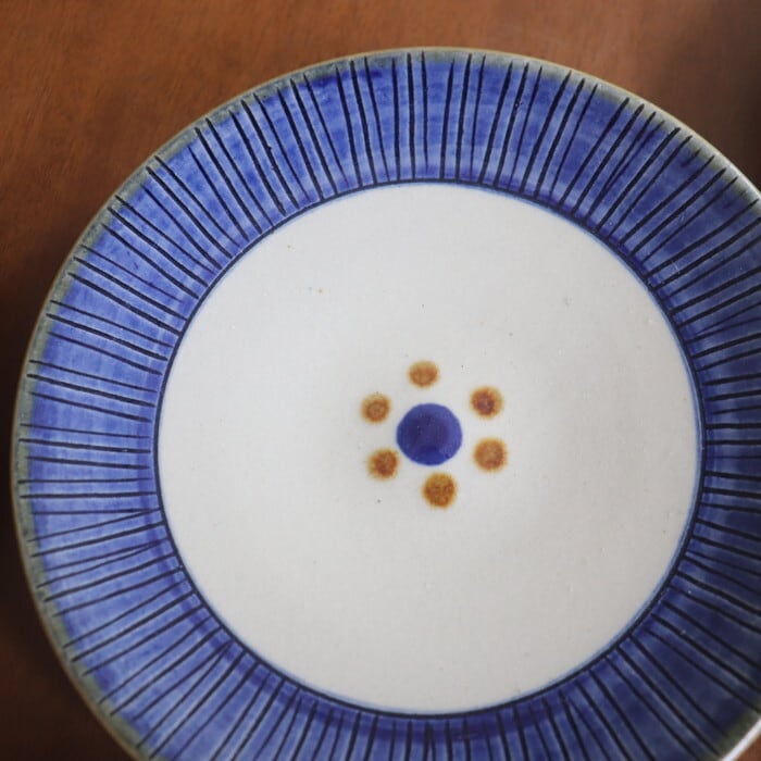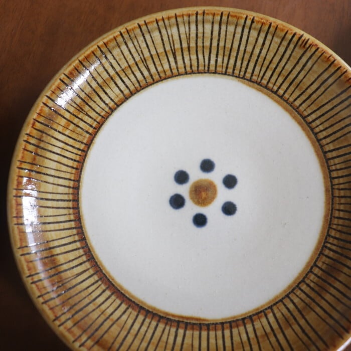 やちむん(沖縄の焼き物)の取り皿サイズの丸皿。ケーキやフルーツ、1品料理などに使いやすい大きさです。縁の部分には、線彫り+光沢のある釉薬が施され、キラキラと宝石のような雰囲気。少し深さのある作りなので、煮込みハンバーグやチキン南蛮など、汁けのあるおかずにも重宝しそうです♬