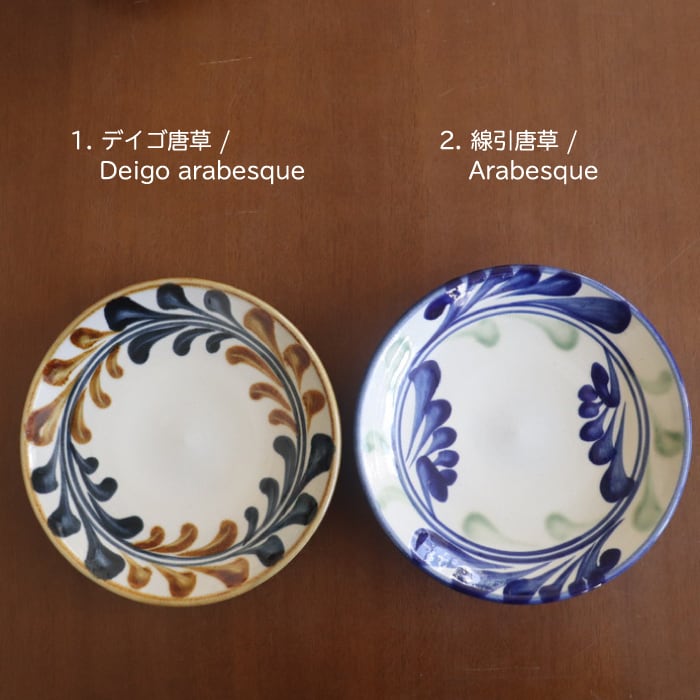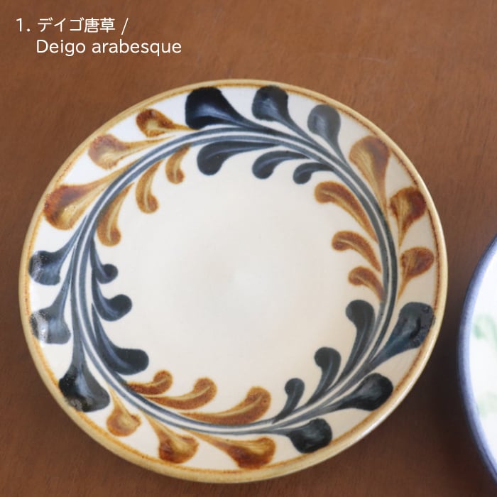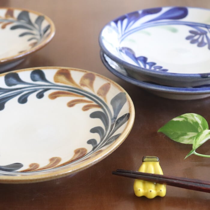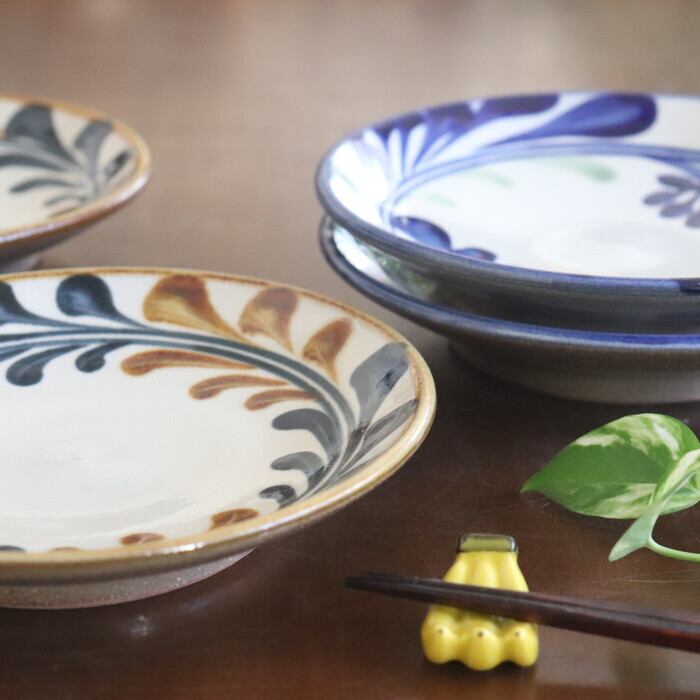 淵回りに描かれた唐草模様が朗らかな雰囲気のやちむん(沖縄の焼き物)の中皿。千切りキャベツに生姜焼きやから揚げ、肉野菜炒めなどといった定番おかずに使いやすいサイズ感です。深さもしっかりある作りなので、小食さん用のカレーやパスタにもぴったり♪