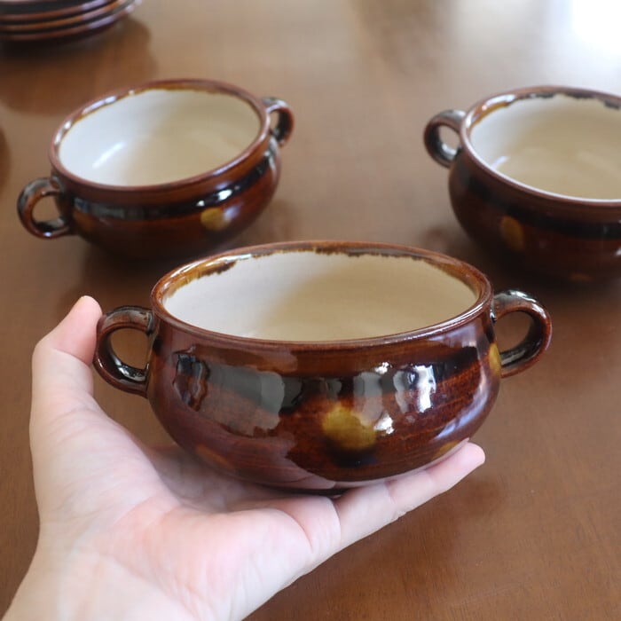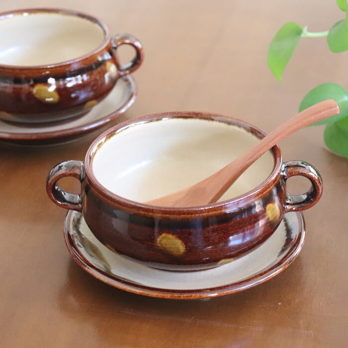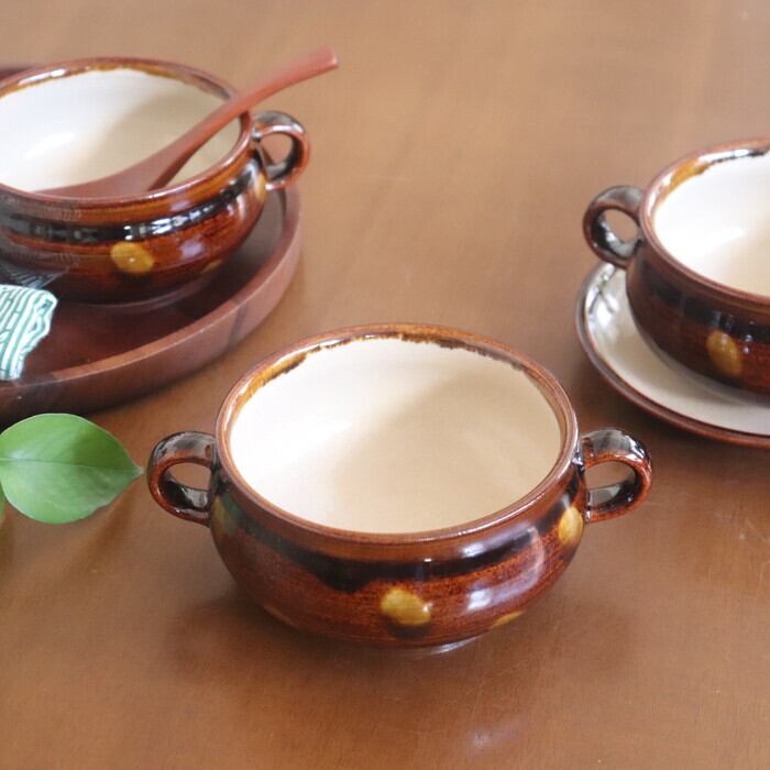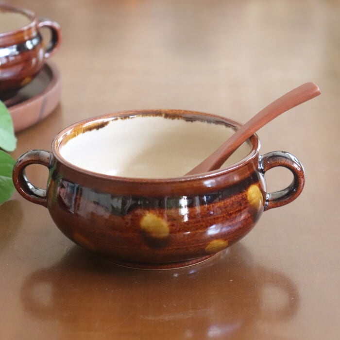 絵本に出てきそうなかわいらしいデザインの、両手付きのスープボウル。シチューや具だくさんのスープにはもちろん、サラダや肉じゃがなど、小鉢としても使いやすいサイズ感です。