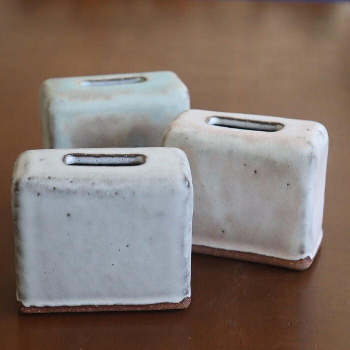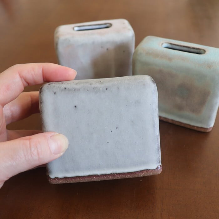 トースターのようなフォルムが特徴的な立方体の花入れ。優しいマットな色合いがかわいらしく、落ち着いた雰囲気です。作り手の比呂さんは、日々の生活の身近に花や植物を感じられるようにと、野に咲く花や庭の枝木をちょこっと入れるのに使いやすいデザインを目指しているとのこと。ドライフラワーにも使いやすいデザインで、プレゼントにもオススメです★