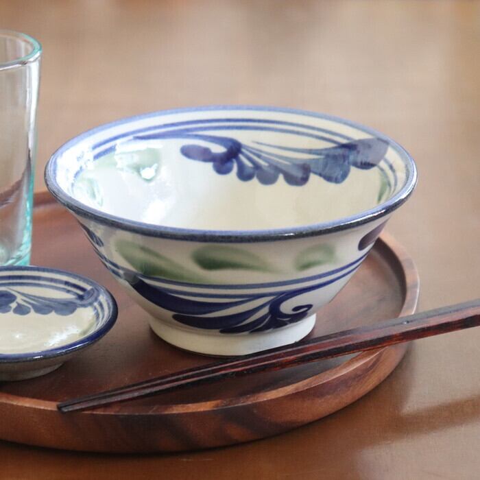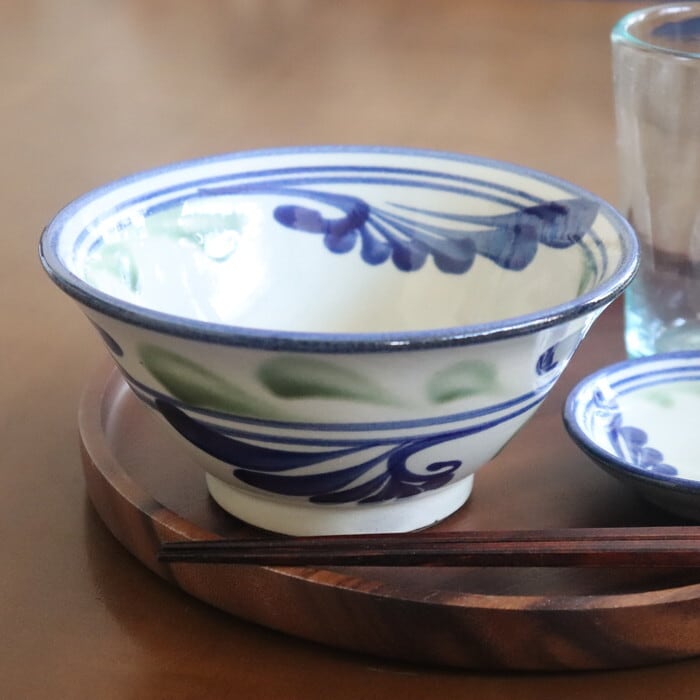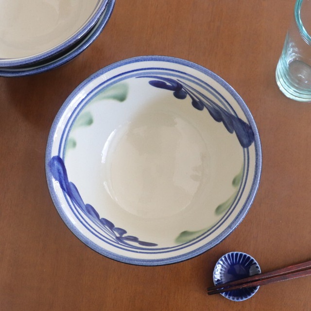 つるっとしたクリーム色をベースに、青と緑で軽やかに描かれた唐草模様が爽やか♪ 明るい気分にしてくれます。サラダやフルーツポンチなどにも良さそうです★