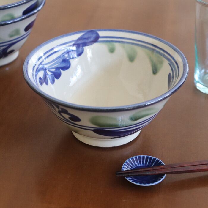 やちむん(沖縄の焼き物)の小どんぶり。天丼やかつ丼などのご飯もののどんぶりや、小ぶりサイズのお蕎麦やにゅう麺などに使いやすい大きさです。