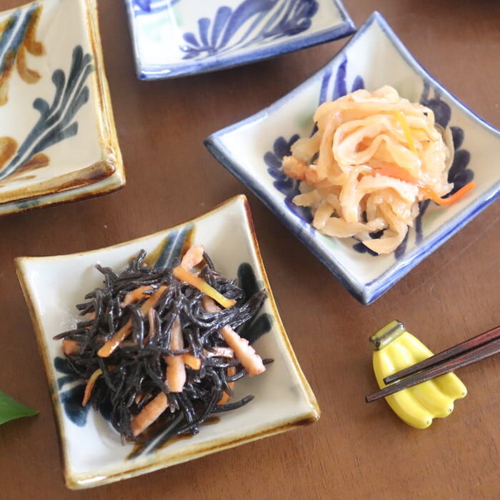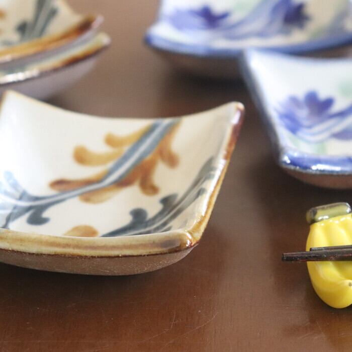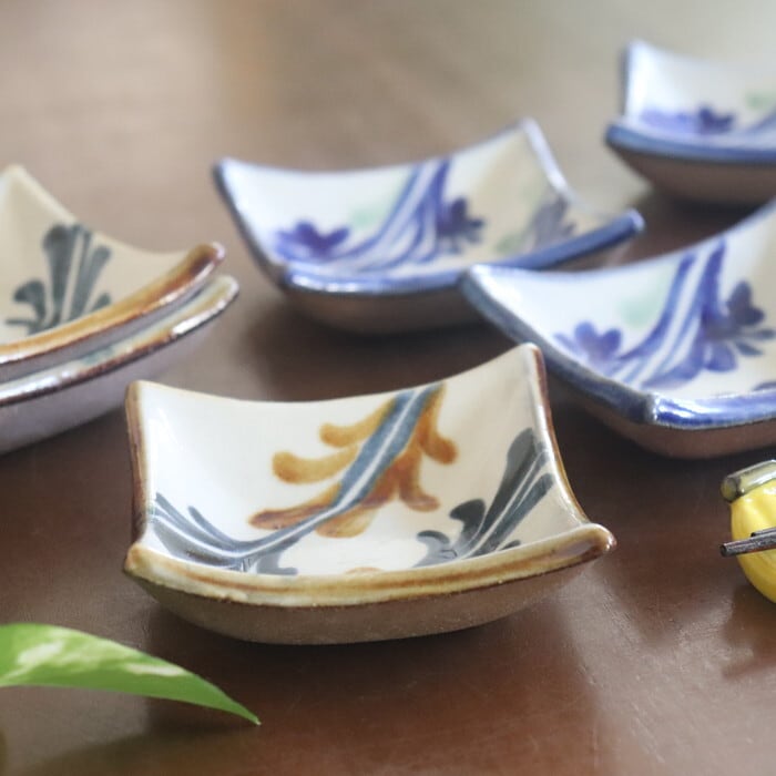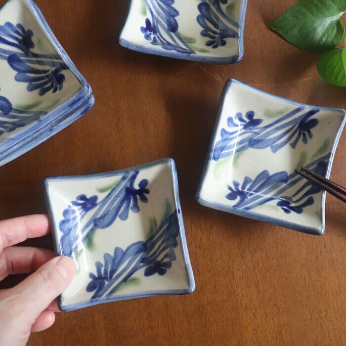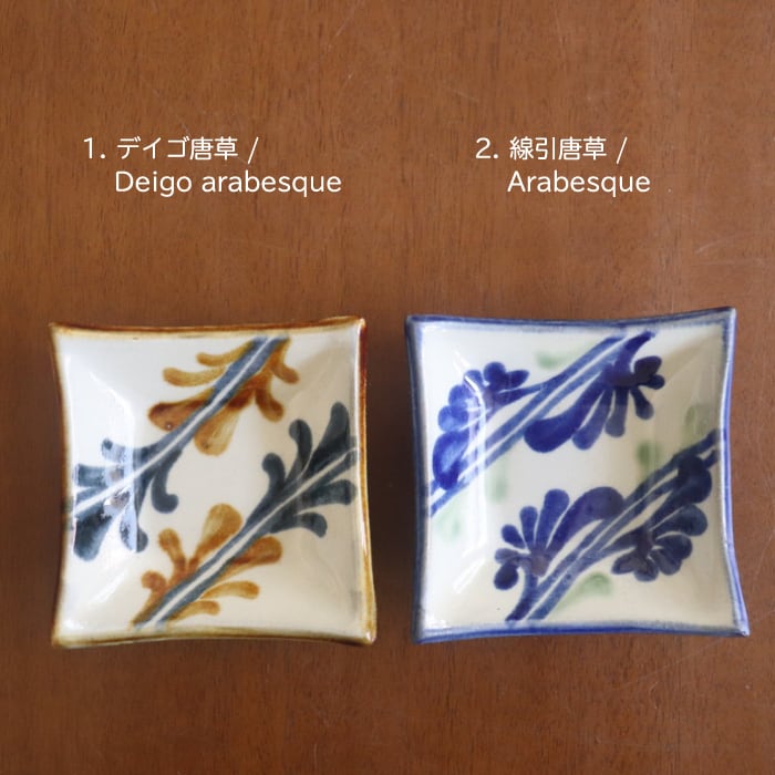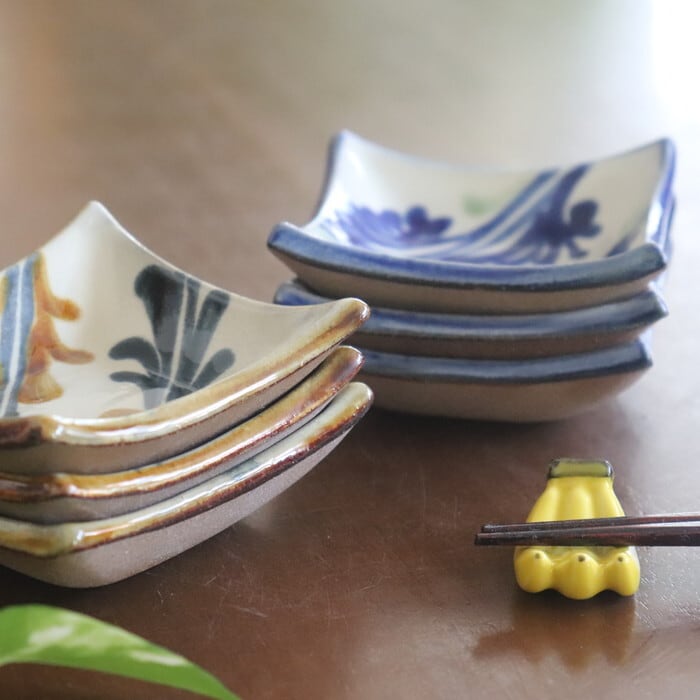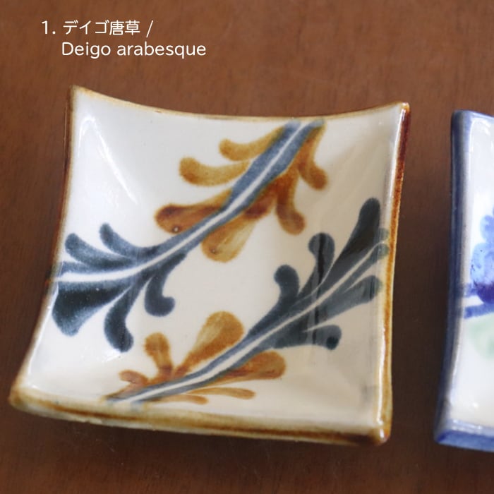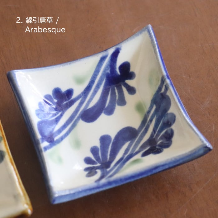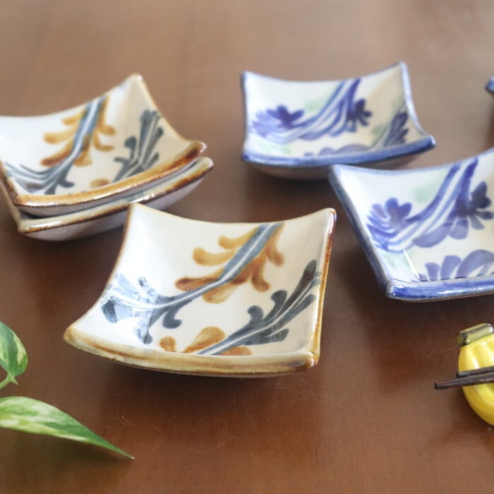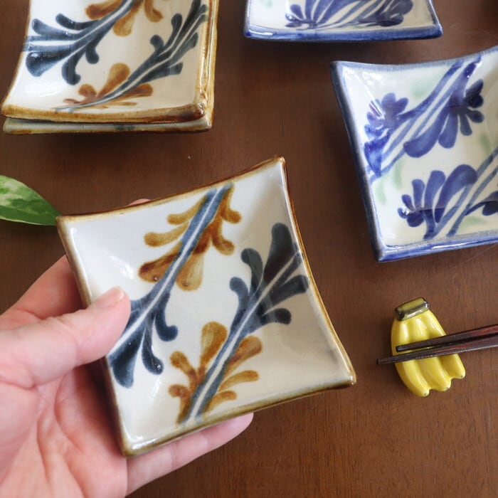 やちむん(沖縄の焼き物)の四角い小皿。ボテっとした厚み(約5mm)の小皿で、梅干しや明太子、お浸しなどのちょっとした総菜をのせるのに使いやすいサイズです。デザインは、沖縄県の花「デイゴ」をモチーフにしたデイゴ唐草と、鮮やかな青と淡い緑が爽やかな線引唐草の2種類。どちらも南国風の陽気な雰囲気で、フルーツやお菓子をちょこっと食べたい時にも重宝しそうです♬