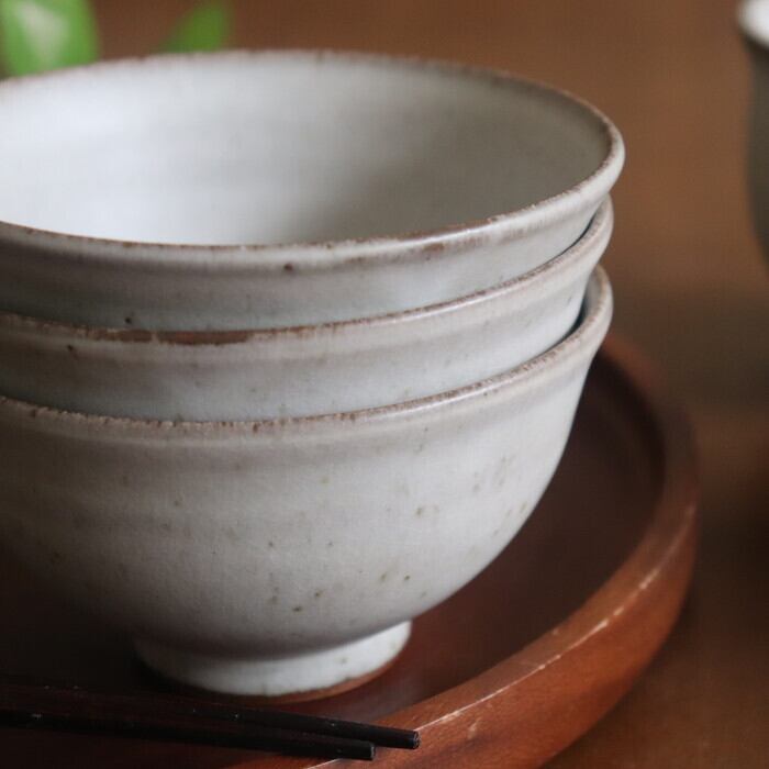 素朴で優しい白の色合いがチャーミングなご飯茶碗。やや小ぶりめの普通サイズで、サラっとした手触りが心地よき♬ 全面に施された落ち着いたマット釉の白も、ほんわか柔らかな雰囲気ながら、洗練された仕上がりに。